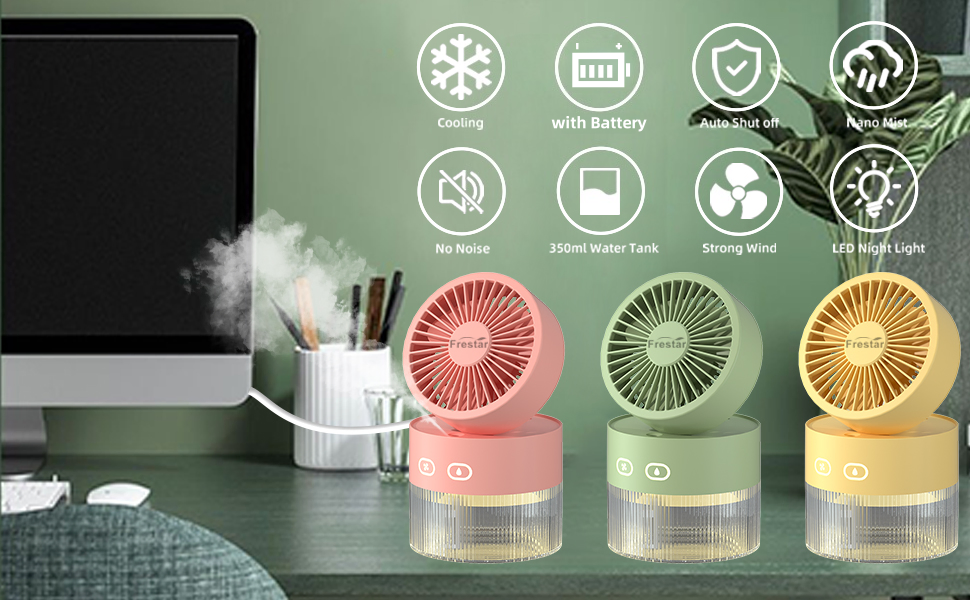 [Portable Misting Fan with 3 Speeds & Dual Mist Modes]This personal cooling fan features Sleep/Natural/Turbo modes and customizable misting (single-click continuous or double-click intermittent spray). Perfect for office desk fan use, small bedside fan needs, or outdoor adventures—all with one-touch control.